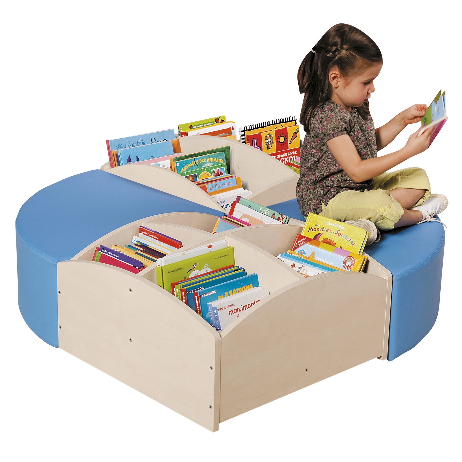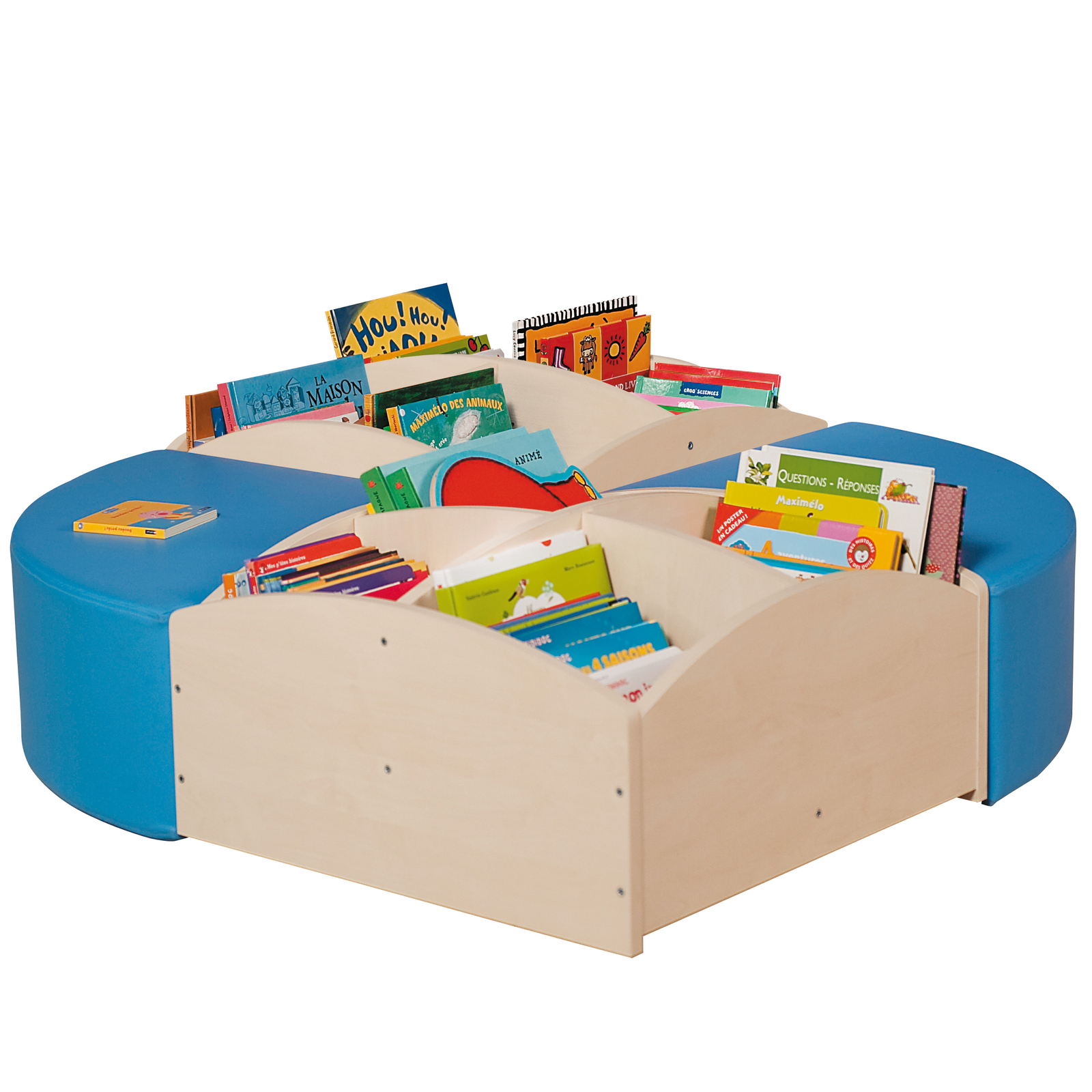 OS- ILOT LECTURE BOULEAU (2 POUFS BLEU QUART DE CERCLE + 2 BACS À LIVRES 4 CASES BAS)