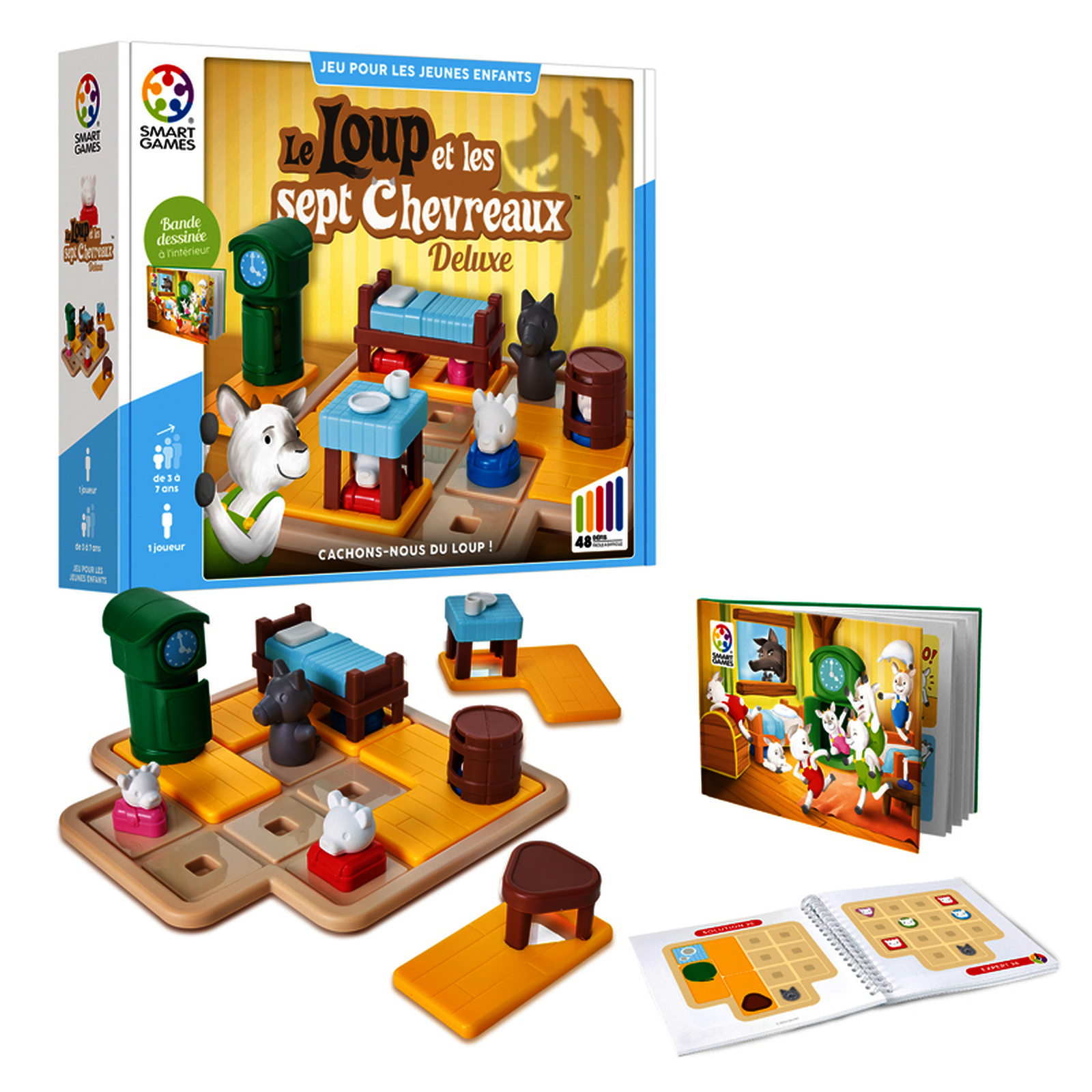 Jeu ?ducatif d?veloppant logique, d?duction, orientation et reconnaissance des formes. 48 d?fis inspir?s du conte 'Le loup et les chevreaux' avec livre illustr? inclus.