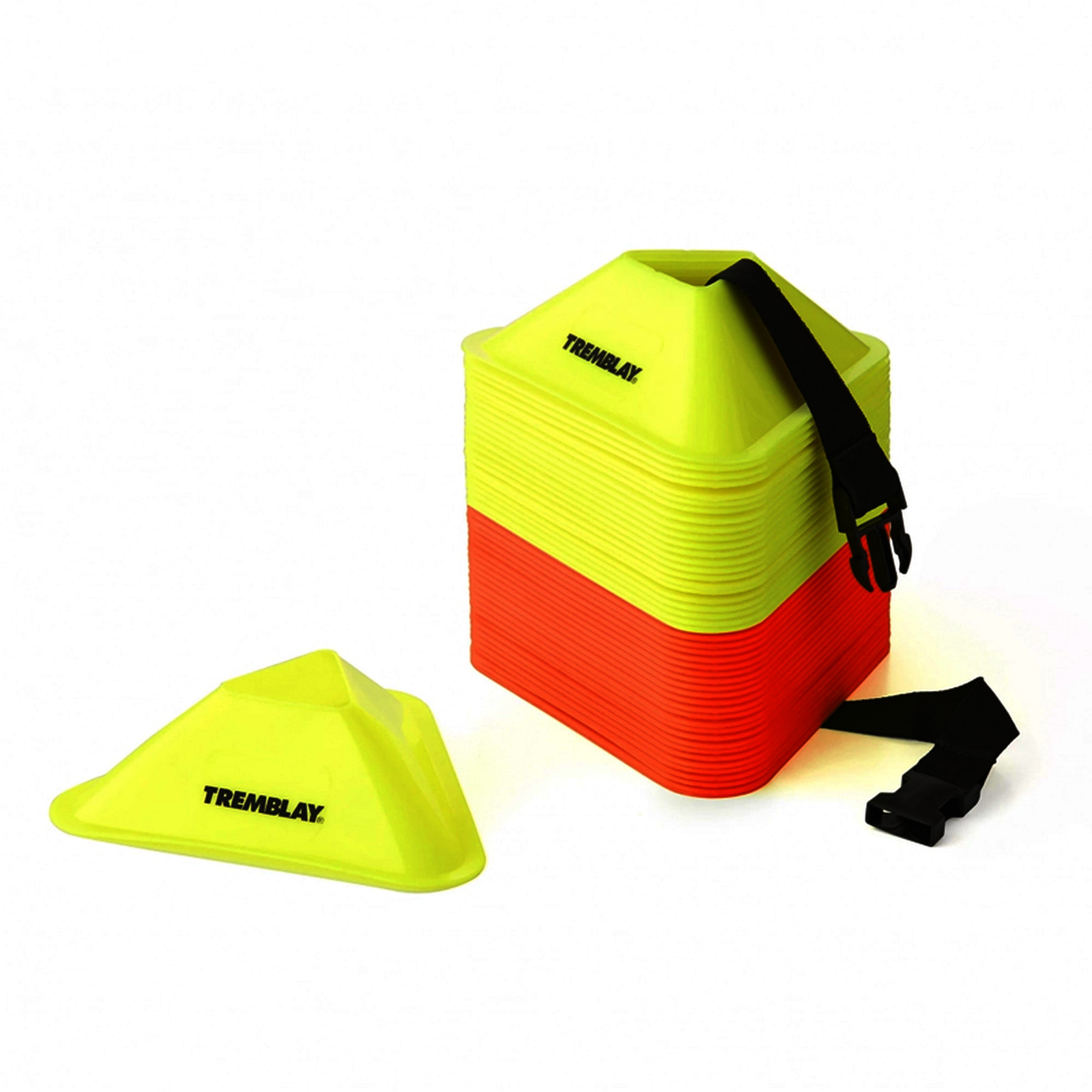Coupelles recycl?es, orange et jaune, id?ales pour activit?s motrices, parcours v?lo, rollers et multisports. Pratiques, l?g?res, avec bandouli?re pour un rangement facile.