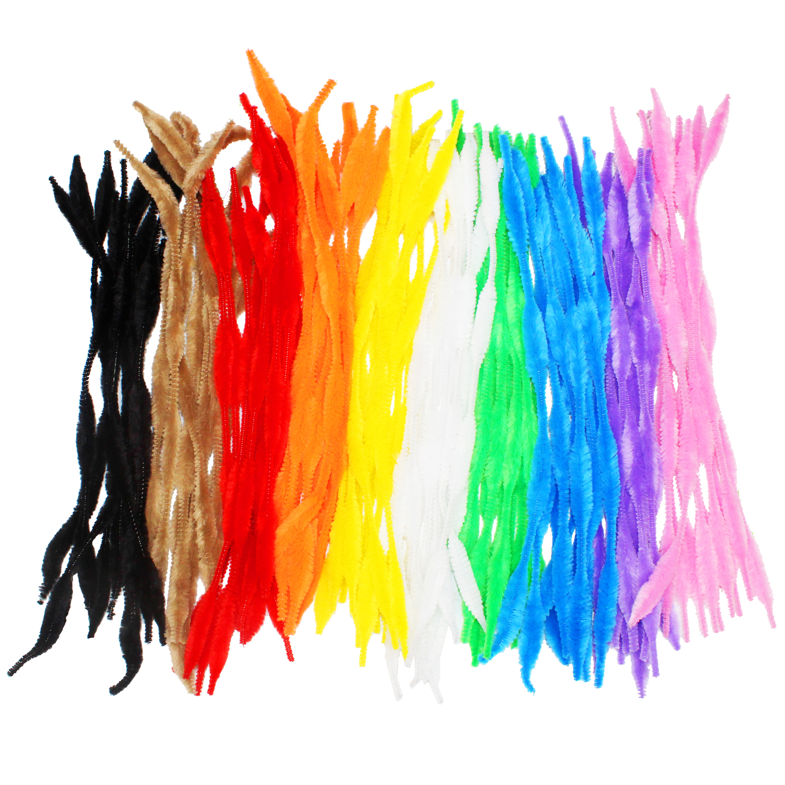 Chenilles au diamètre changeant. Ø 10 mm - L 30 cm - Lot de 100 brins - 10 coloris assortis (rose, violet, jaune, vert, blanc, bleu foncé, bleu clair, rouge, orange et noir)